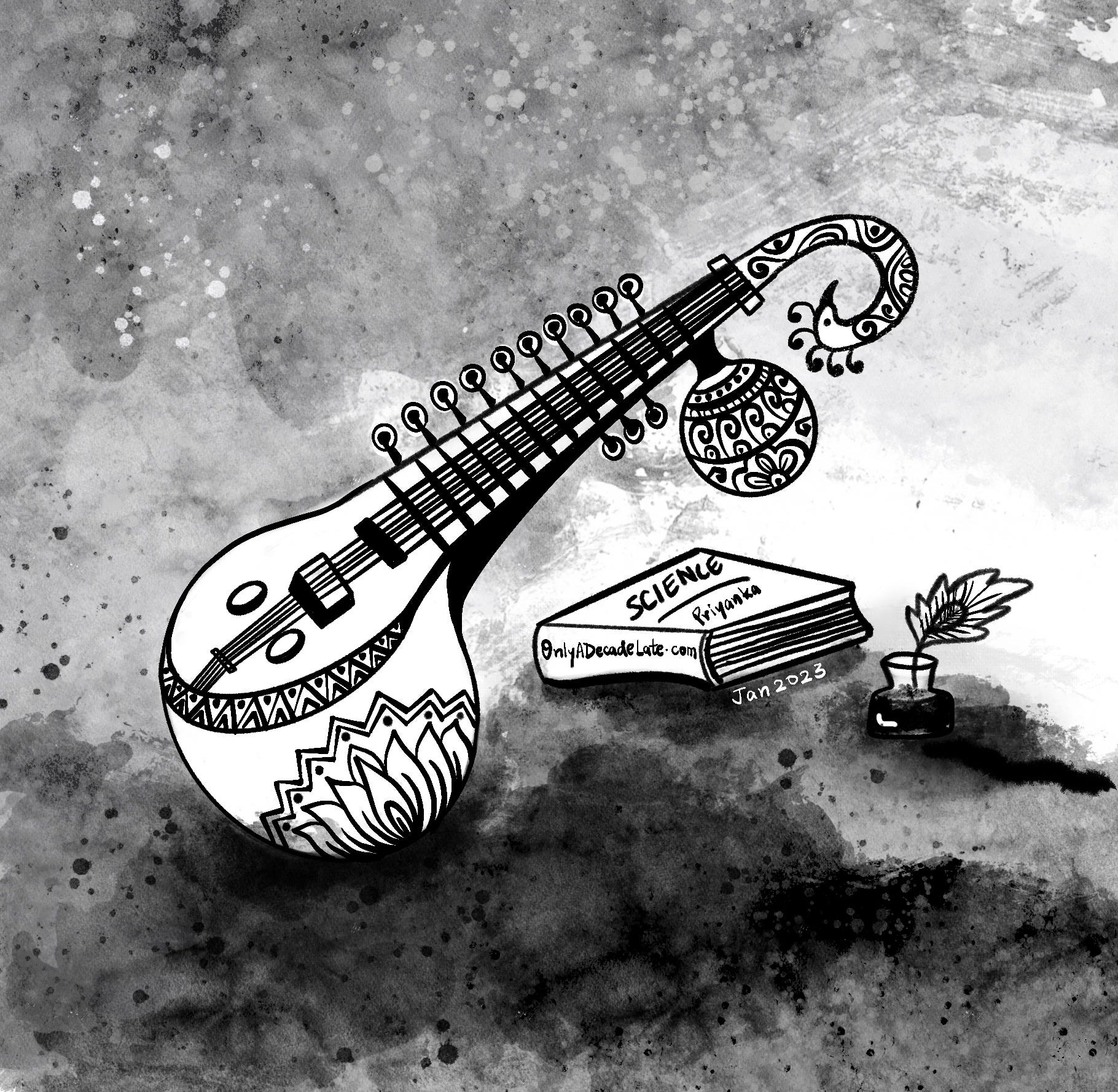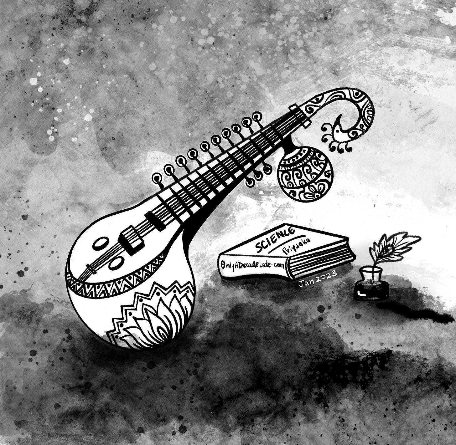 Goddess Saraswati is the Hindu Goddess of knowledge, wisdom, music, arts, creativity and learning. She carries a veena as her instrument. Here’s my rendition of what I consider as a potpourri of art and knowledge, i.e. the intersection of the left and the right brain.